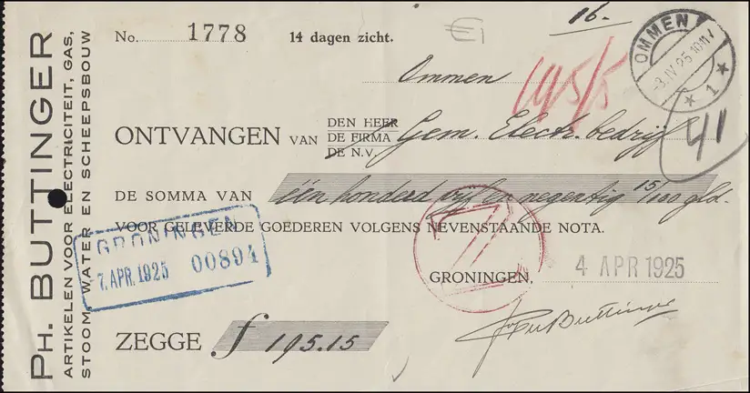 Pays-Bas Crédit de paiement OMMEN 3.4.25 par Groningen 4/7.4.1925 & Temple rouge Z