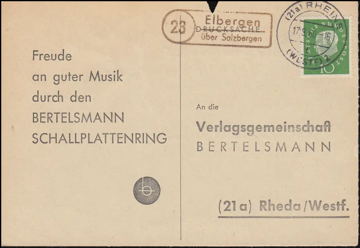 Pays-Bas: Elbergen sur Salzberg, carte postale RHEINE 17.9.60 vers Rheda/Westf.