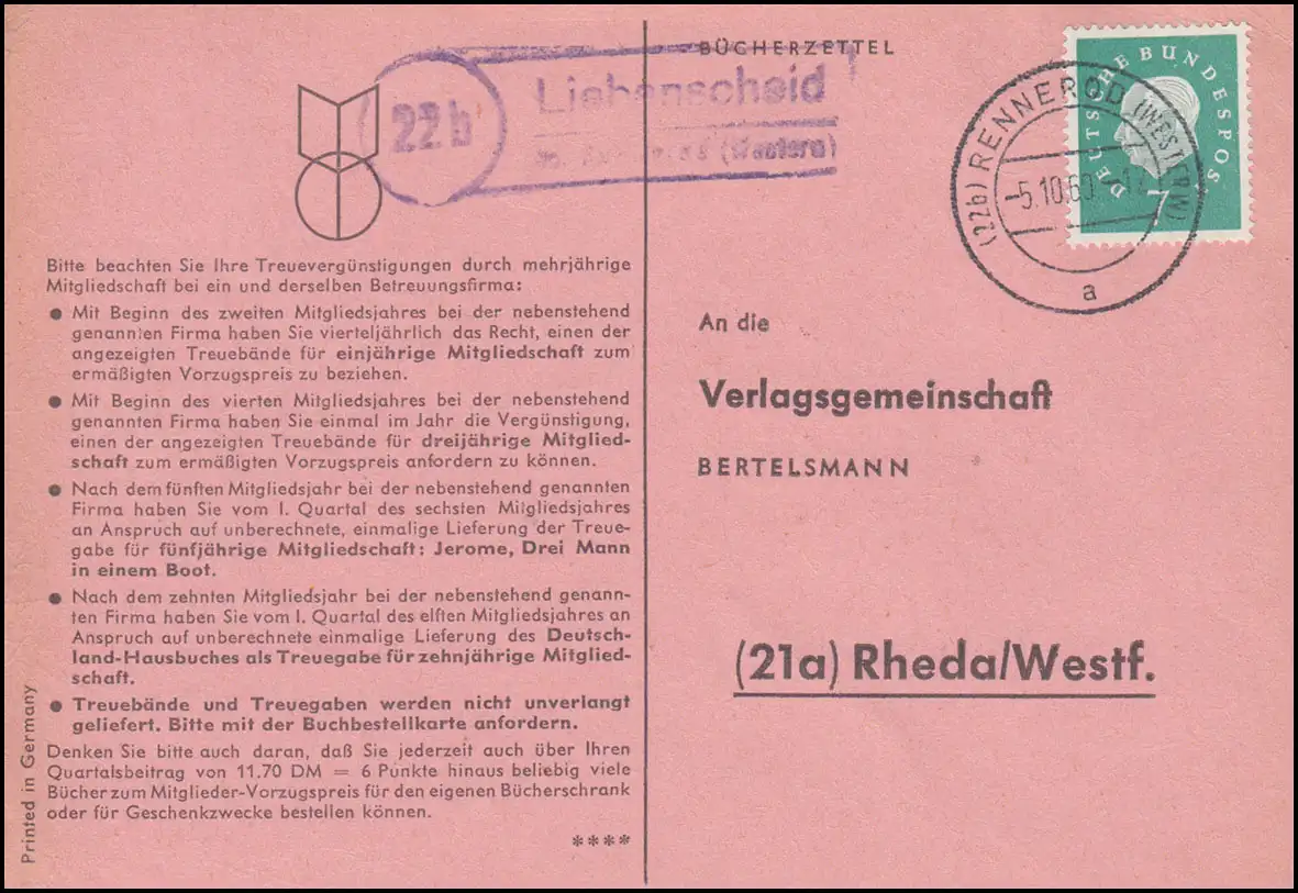 Pays-Bas Liebenscheid sur RENNEROD 5.10.1960 sur carte postale vers Rheda/Westf.