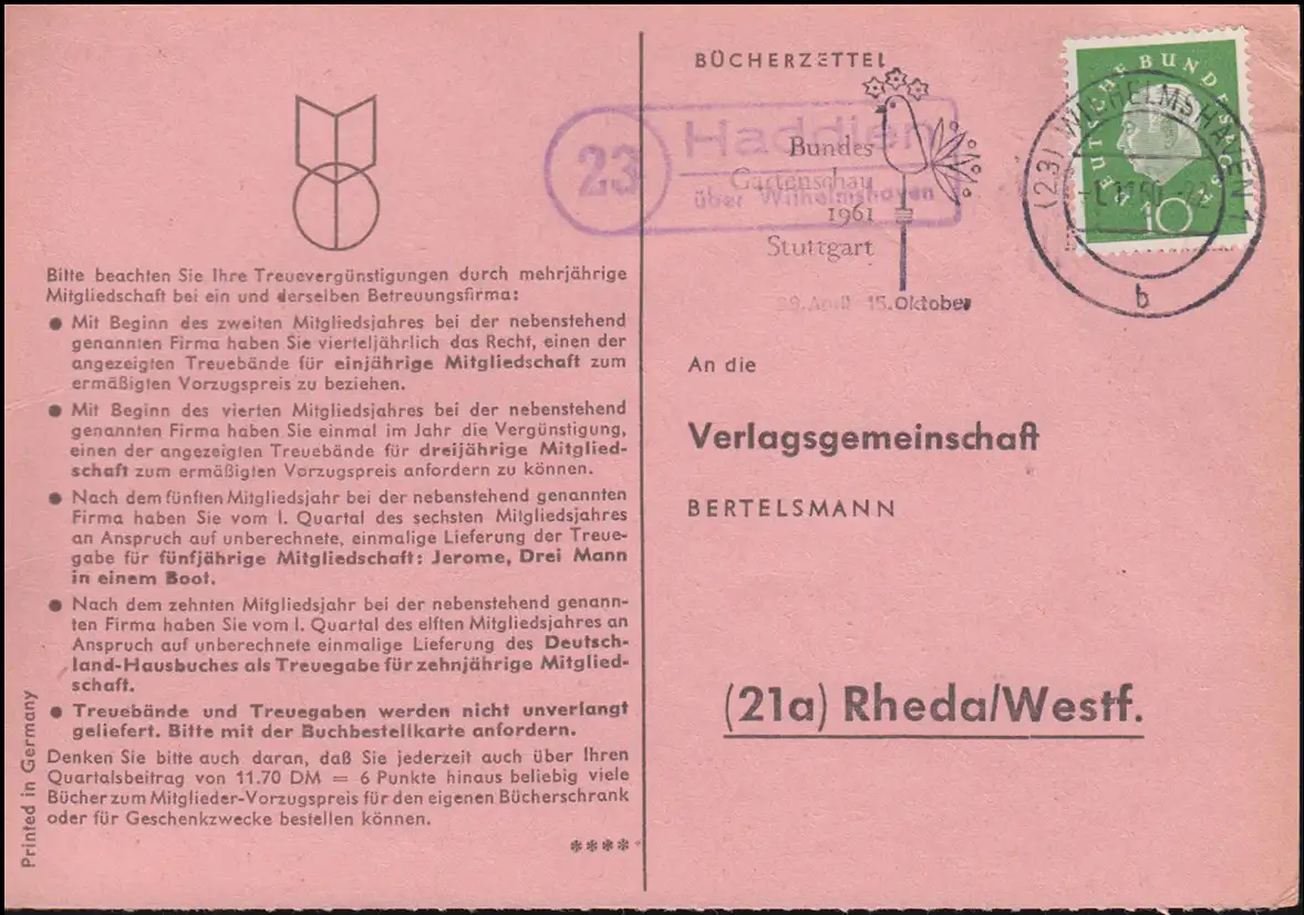 Pays-Bas Post de Haddie sur WILHELMSHAVEN 1.11.1960 sur les brochures de Rheda/Westf.