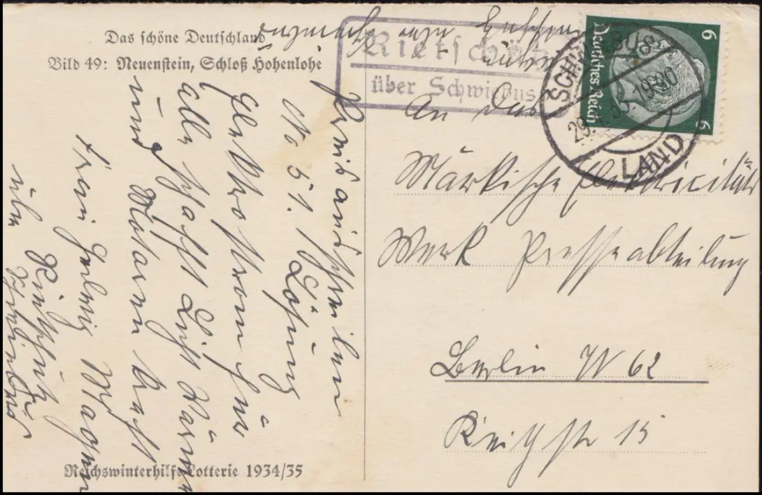 Pays-Bas: Rietschütz par SCHWIEBUS LAND 29.4.35, AK Neuenstein/Schloss Hohenlohe