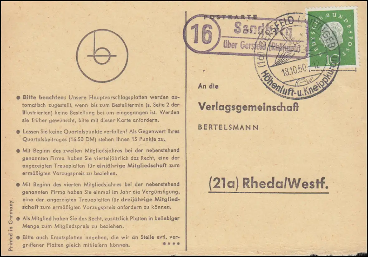 Pays-Bas Sandberg via Gersfeld (Rhönbeb.) sur carte postale SSt GERSFELD 18.10.1960