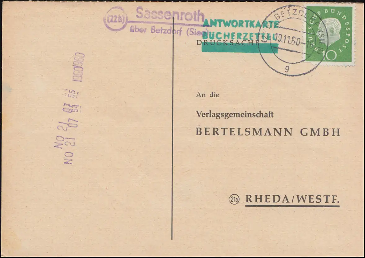 Pays-Bas: Sassenroth via BETZDORF (SIEG) 19.11.1960 sur carte postale vers Rheda