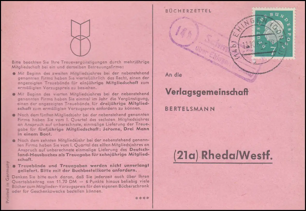 Pays-Bas Schmiechen sur HEURINGEN (DONAU) 11.10.1960 sur carte postale vers Rheda