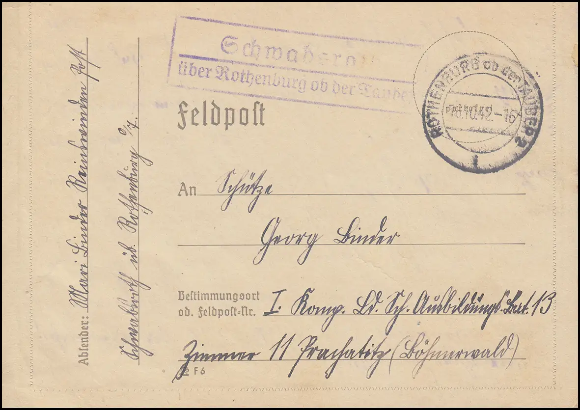 Pays-Bas Schwabsroth sur ROTHENBURG si le Tauber 18.10.1942, lettre postale de champ