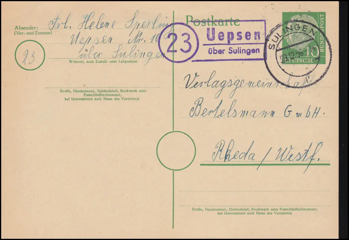 Pays-Bas: Uepsen via SULINGEN 29.12.1956 sur carte postale vers Rheda/Westf.