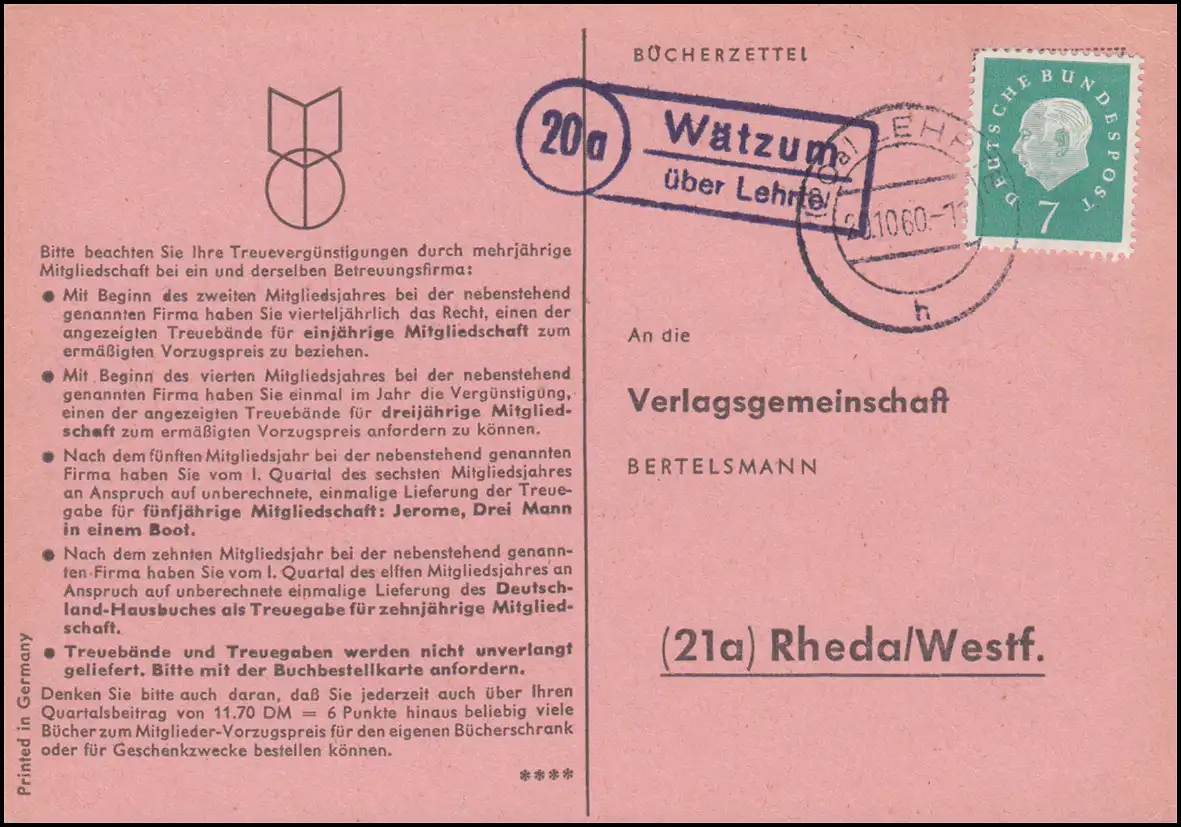 Pays-Bas Wäfzum über ENSEIGNER 20.10.1960 sur carte postale après Rheda
