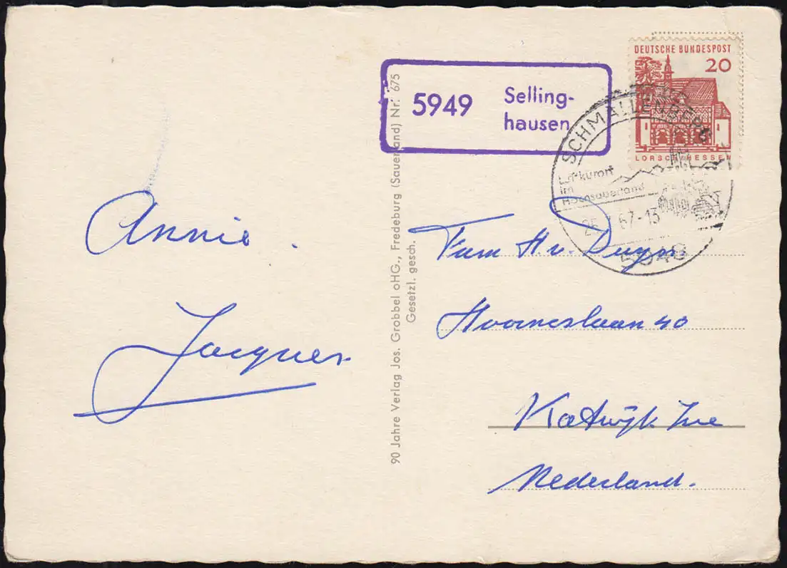 Pays post 5949 Sellinghausen sur AK Belle Sauerland SSt SCHMALLENBERG 25.7.67