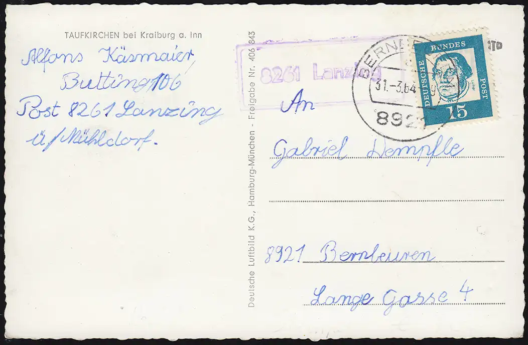 Payspost 8261 Lanzig sur AK Bauptkirchen près de Kraiburg, BERNBEUREN 31.3.64