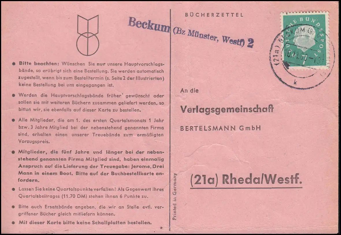 Payspost Beckum (Br. Münster Westf) 2 sur carte postale BECKUM 10.11.1960 vers Rheda