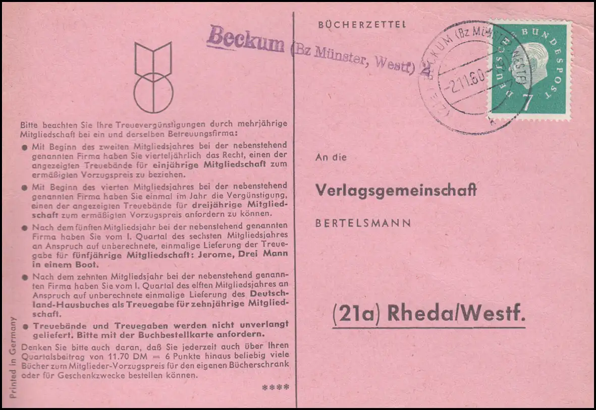 Payspost Beckum (Br. Münster Westf) 2 sur carte postale BECKUM 2.11.60 vers Rheda