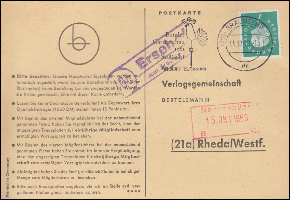 Payspost Ersehof sur BRAUNSCHWEIG 14.10.1960 sur carte postale vers Rheda
