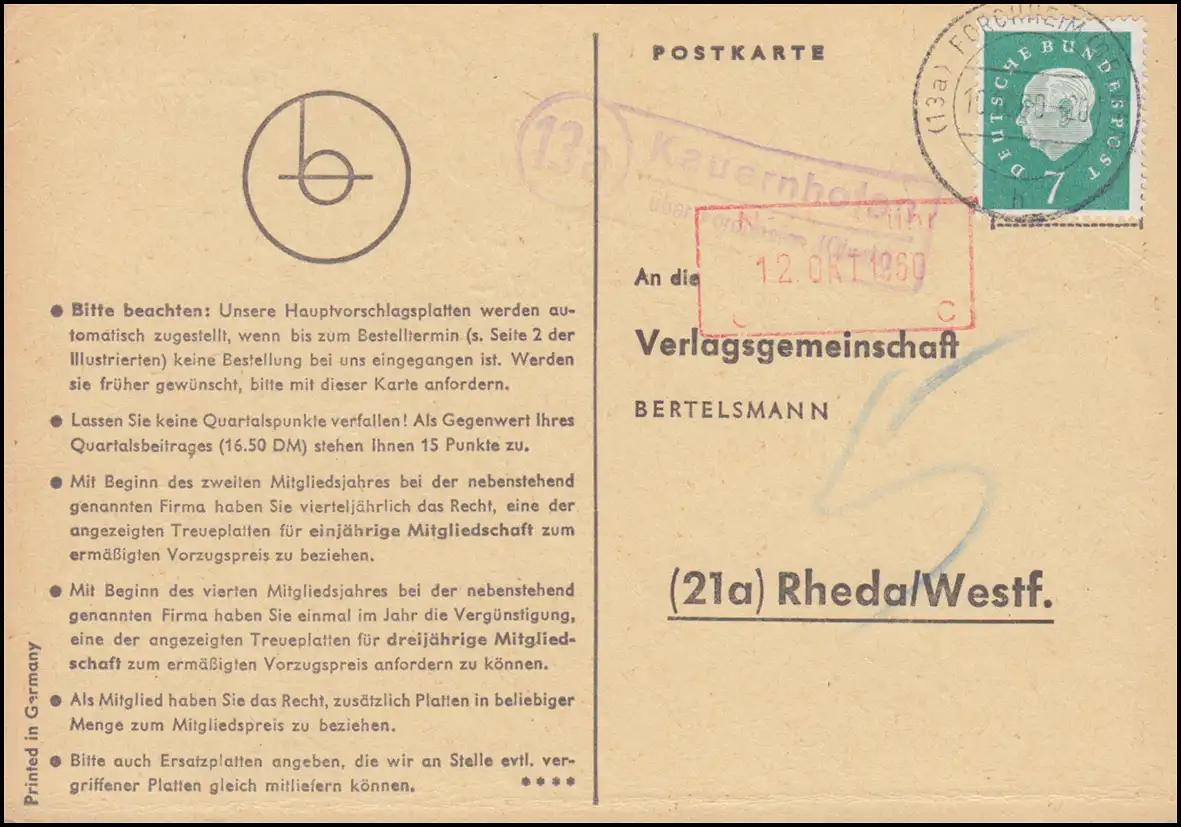 Payspost Kauernhofen sur FORCHHEIM (OBERFR.) 10.10.60 sur carte postale vers Rheda