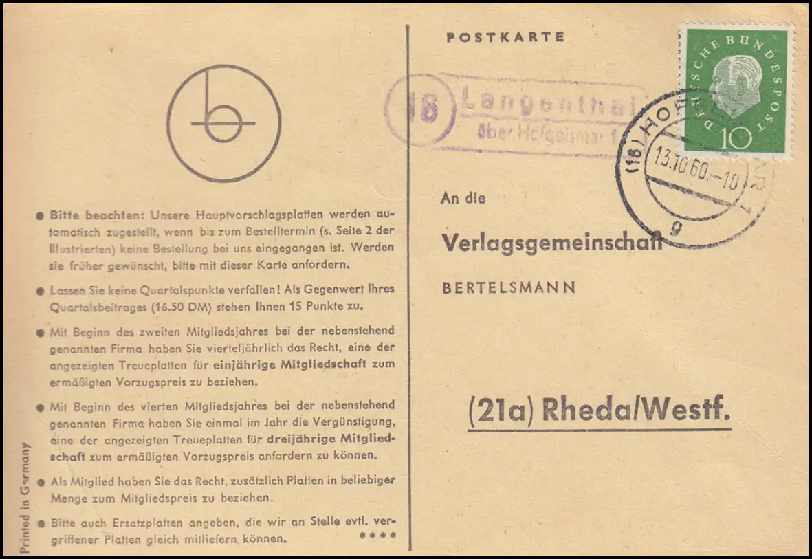Payspost Langenthal via HofgeisHEIM 1 - 13.10.1960 sur carte postale vers Rheda