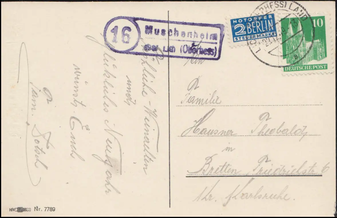 Payspost Muschenheim sur LUMIÈRE (OBERHESSEN) PAYS 22.12.1949 sur AK Noël