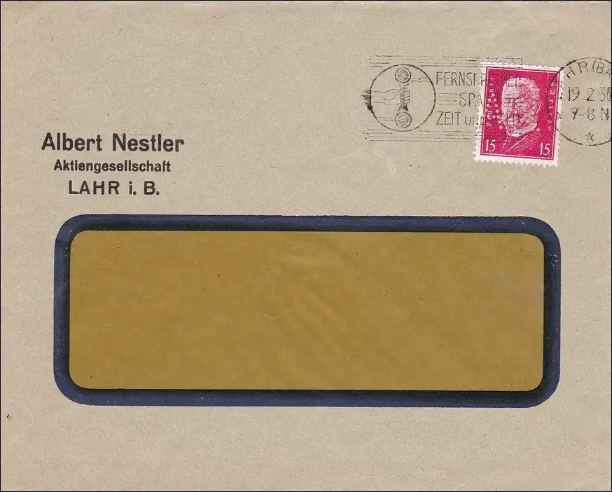 Perfin: Lettre de Lahr au Breisgau, Albert Nestler, 1930, A.N.