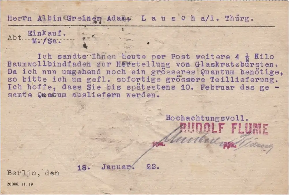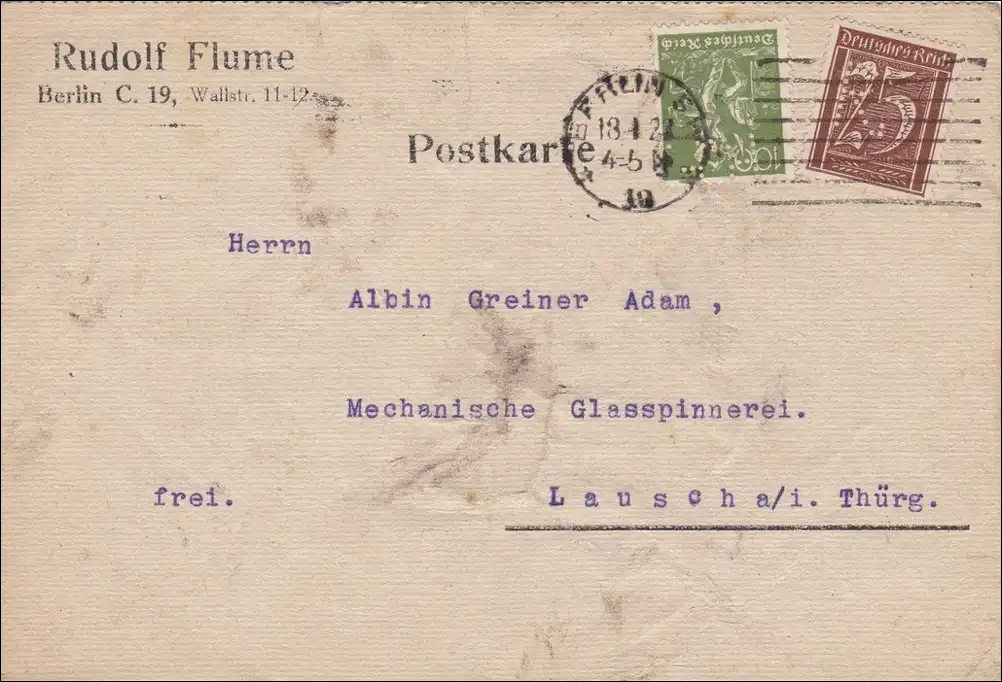 Perfin: Carte postale, Rudolf Flume, Berlin, 1927, RF vers Lausch, Thuringe