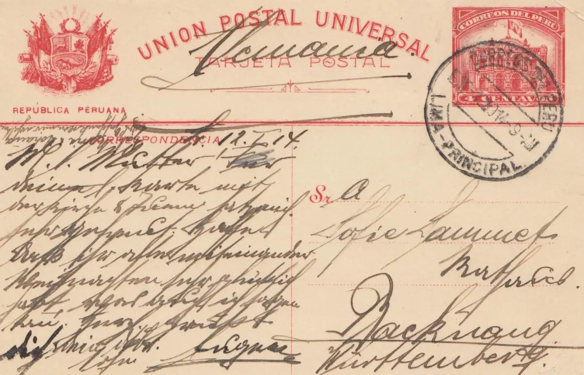 Pérou 1914: post card Lima como Sera Manana, to Backnang
