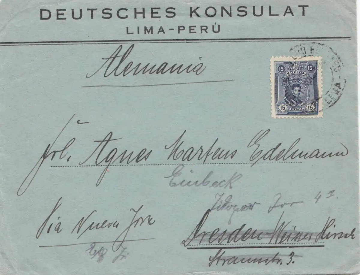 Pérou Consulat allemand Lima to Dresden, forwarded to Einbeck