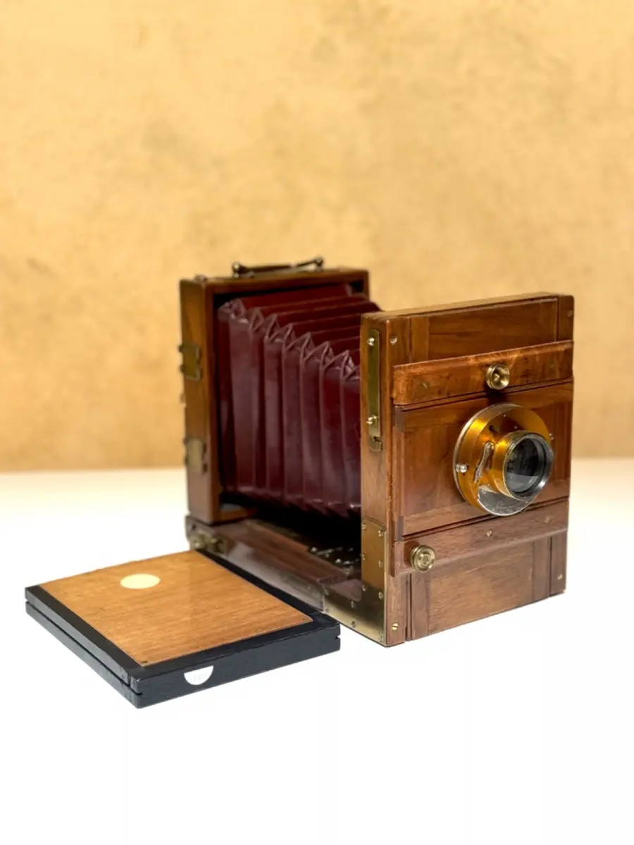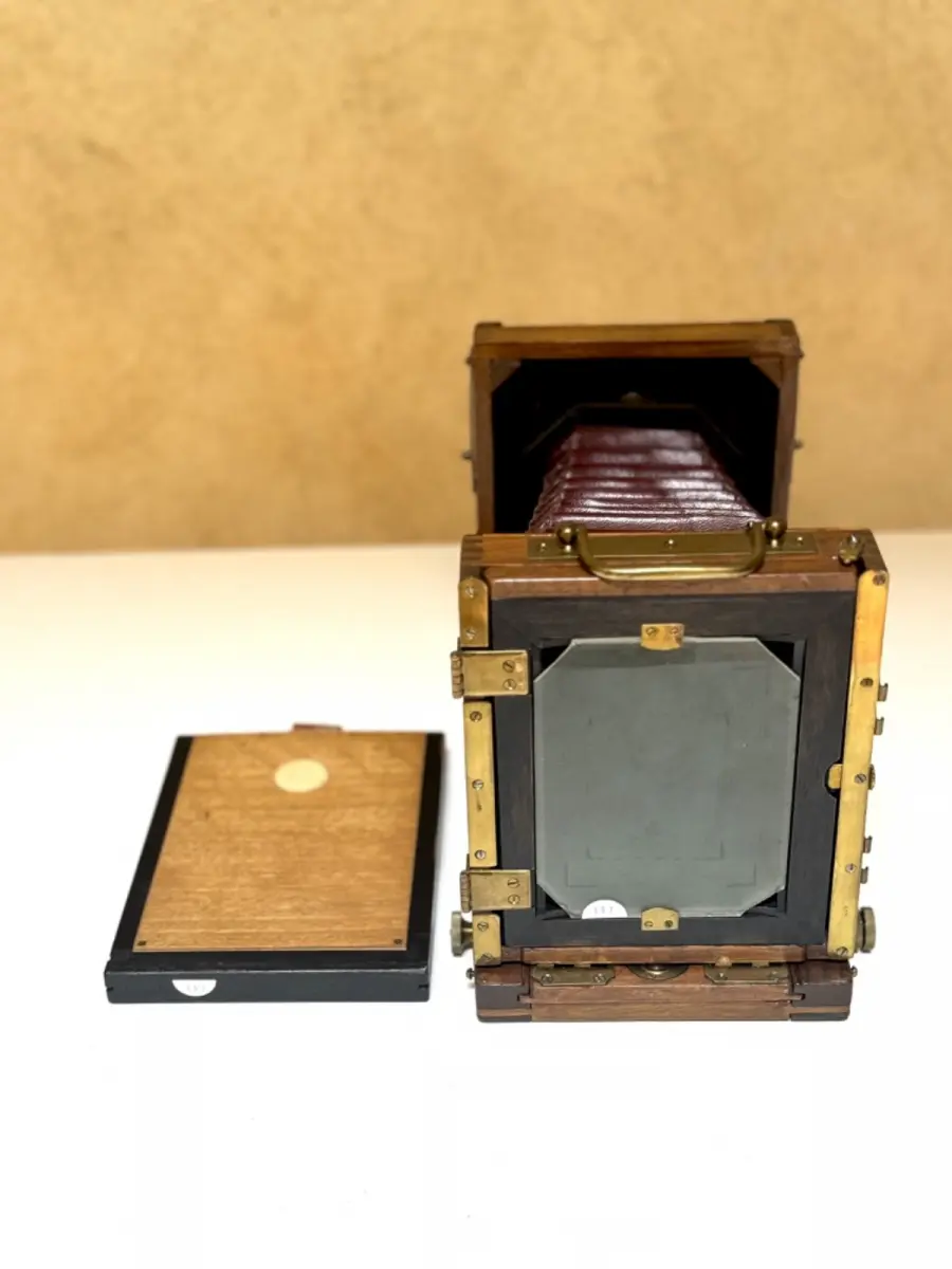 Petite chambre photographique de voyage format 9 x 12, en noyer verni, soufflet en cuir de Russie rouge.