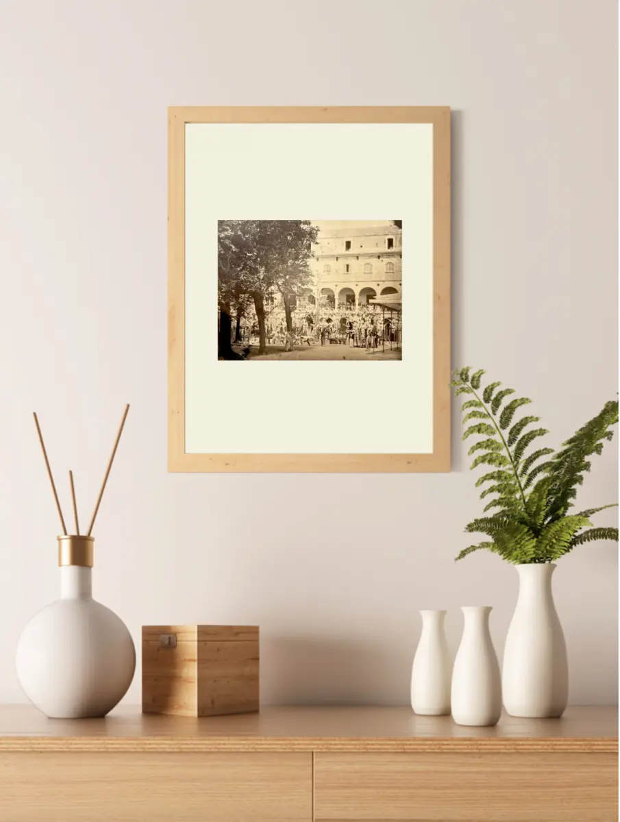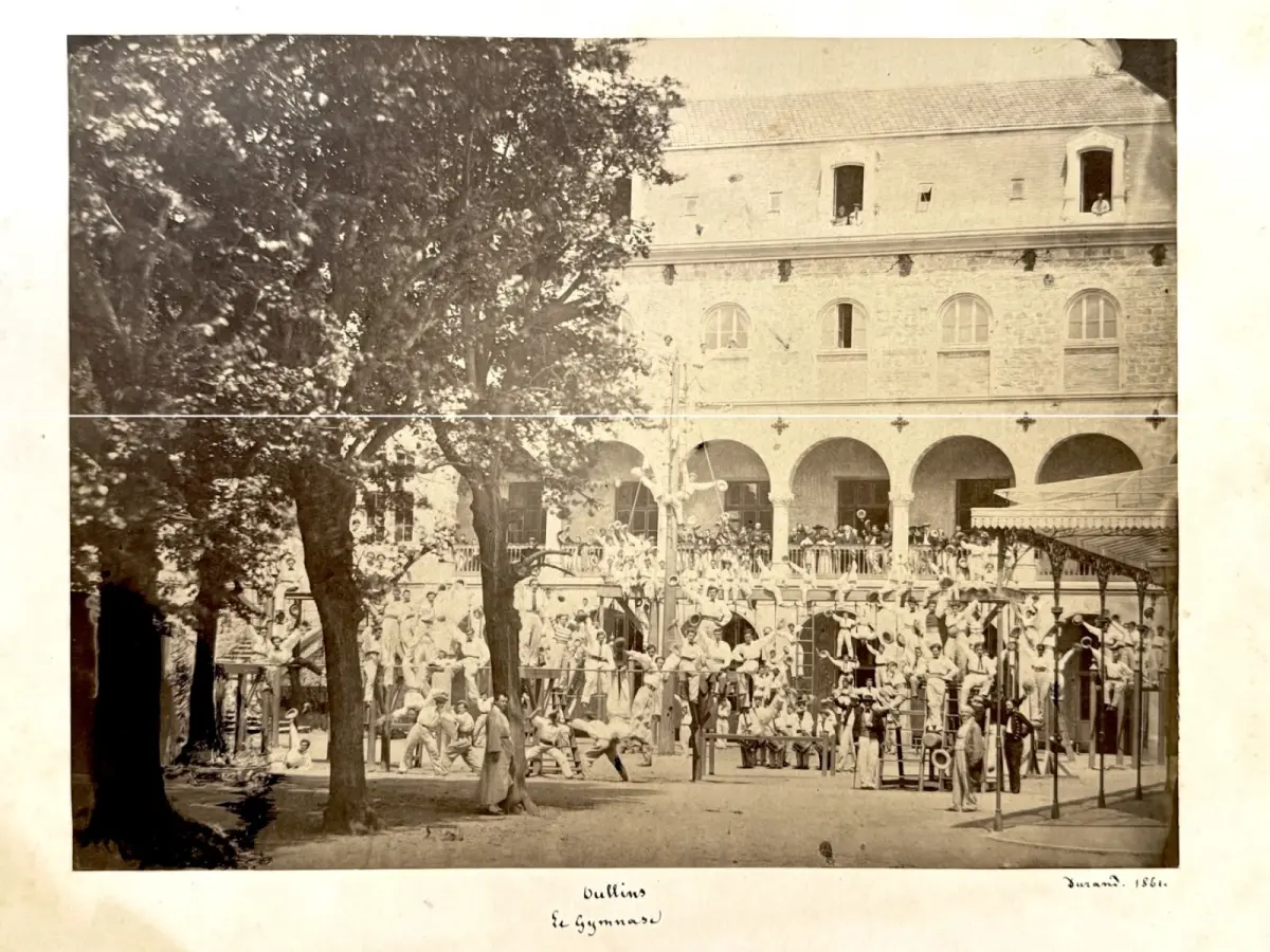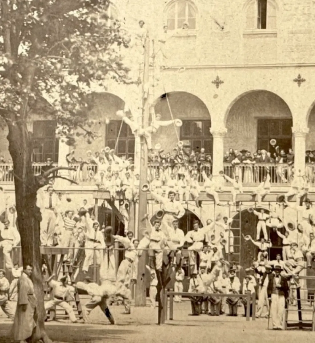 On distingue des pyramides humaines, des lutteurs, des funambules... et sur le balcon une foule admire le spectacle. C'est une composition exceptionnelle compte-tenu du temps de pose nécessaire et du nombre de personnes photographiées.