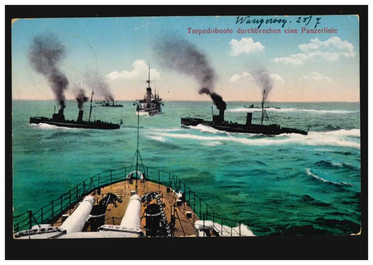 Photo AK Bateaux de guerre Torpilles percèrent une ligne blindée WANGEROOGE 1914