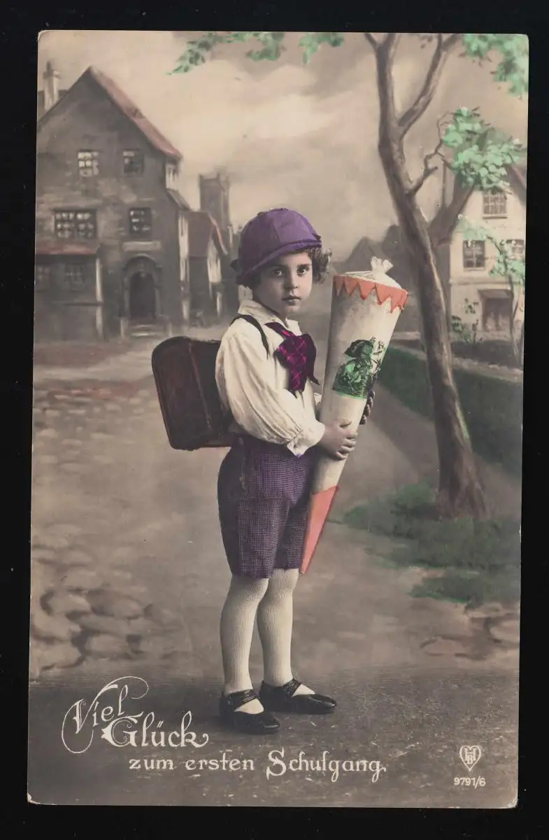 Photo AK HB 9791/6 Jeune Ranzen violet pantalon casquette Schultütte, Niederoderwitz 19.4.27