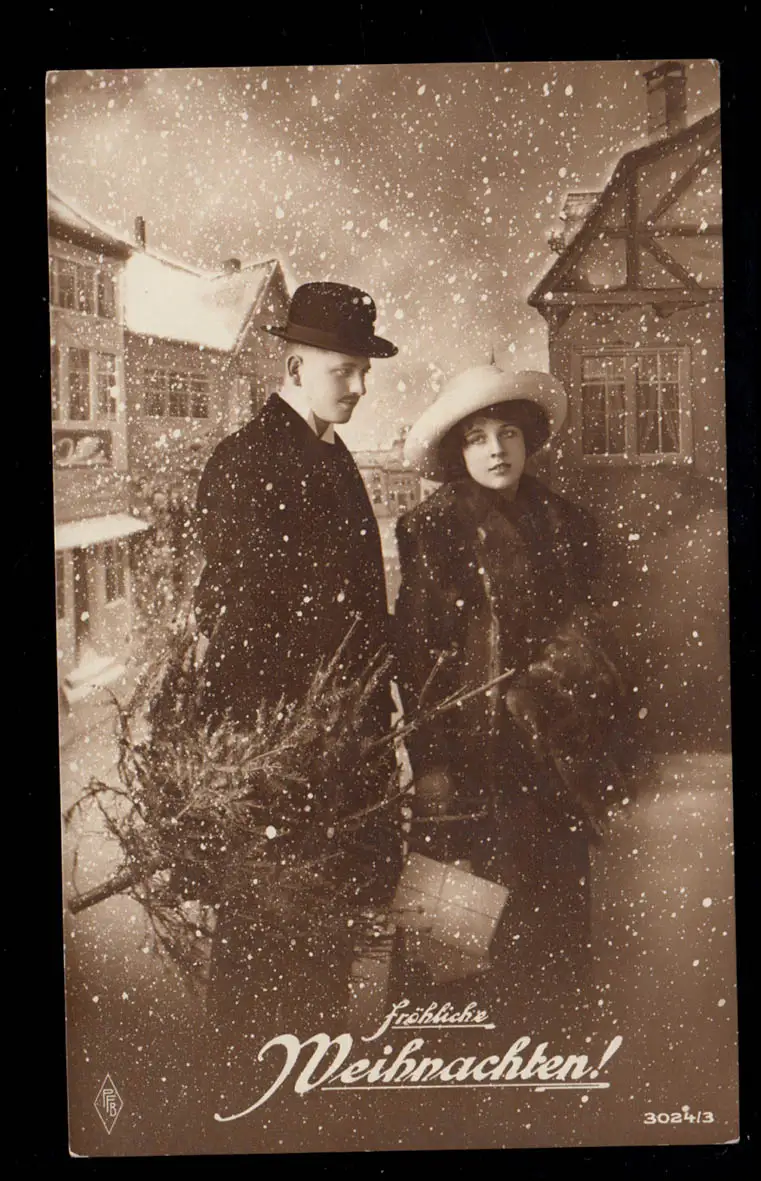 Photo AK Noël: Couple avec arbre de Noël dans la neige, inutilisé