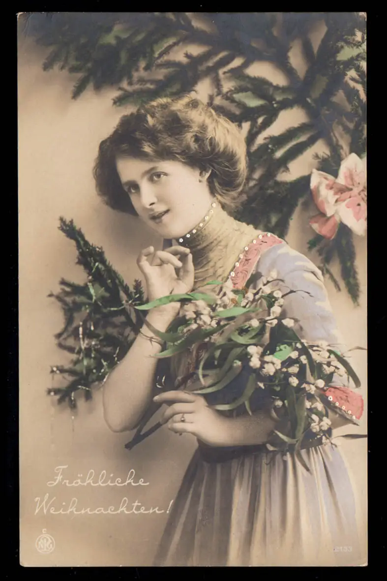 Photo AK Noël: femme souriante avec bouquet de baies de perles, inutilisé