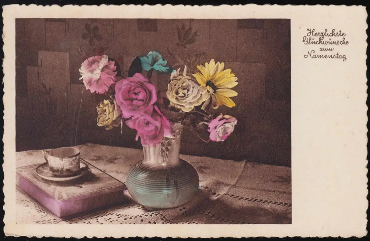 Photo AK OKW 728 déco de table fine, fleurs de vase, plafond de dentelle, jour de nom, vers 1930
