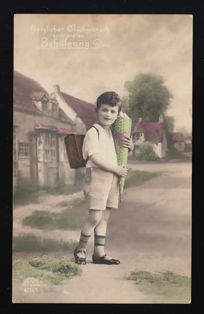 Photo AK R & K L. 6234/3 Knabe Ranzen Sac scolaire coloré, Niedoderwitz 19.4.27