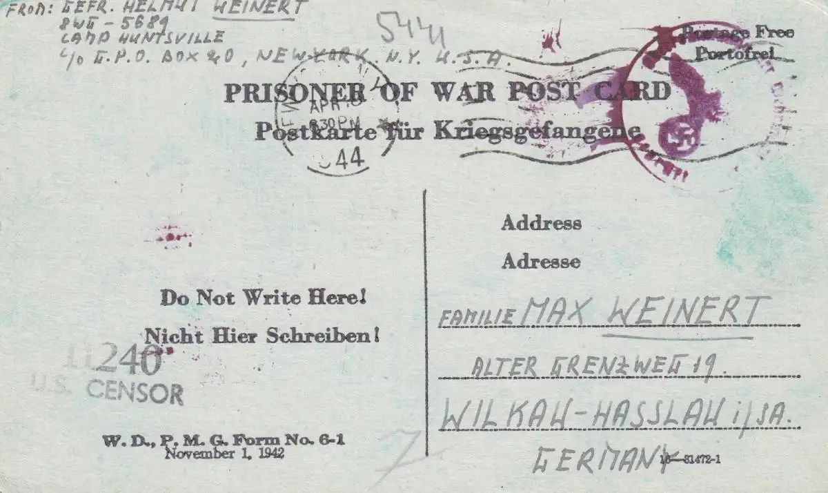 PoW - Post card New York to Wilkawa-Hasslau, OKW centor, US-censor 1944,