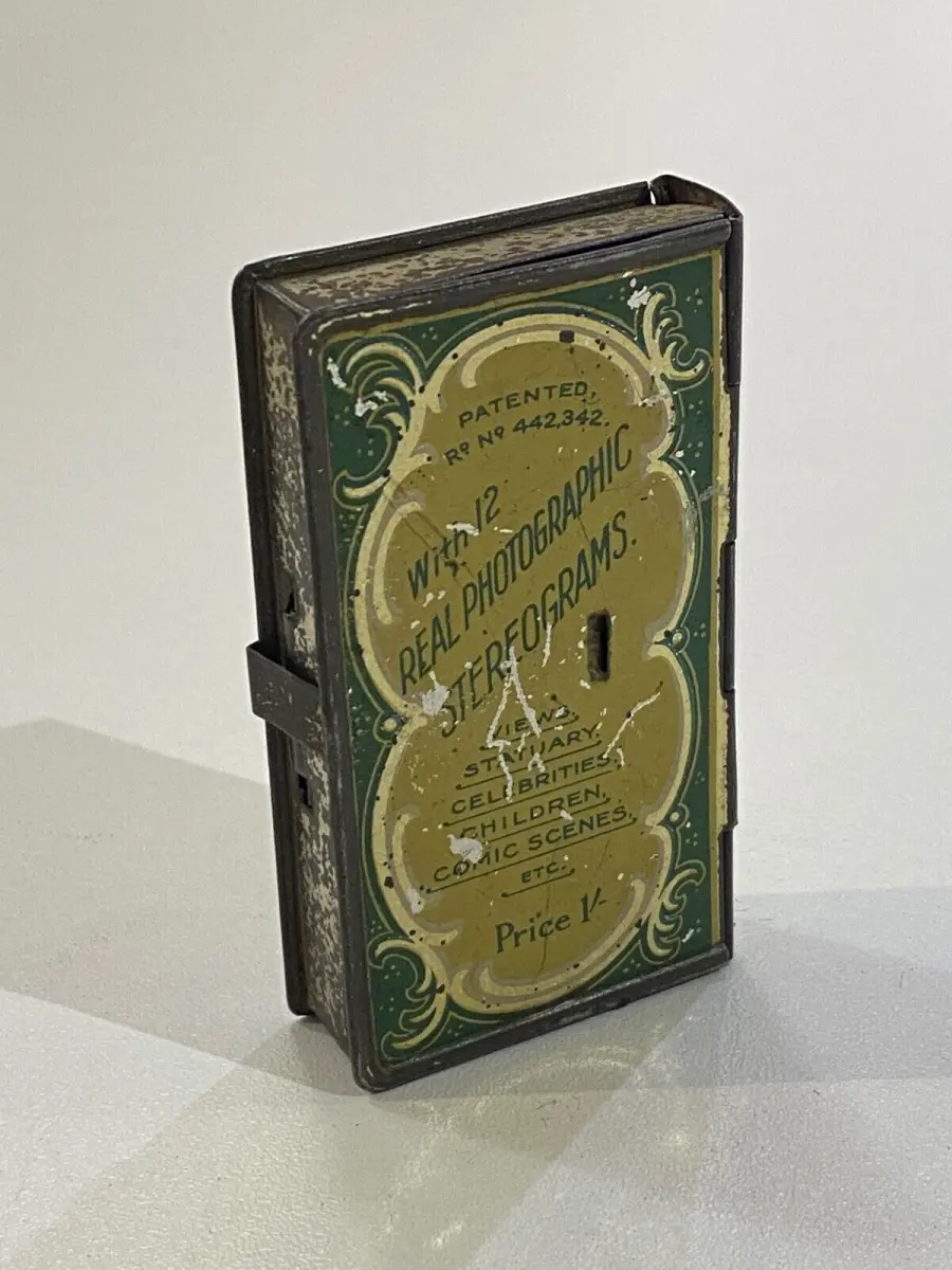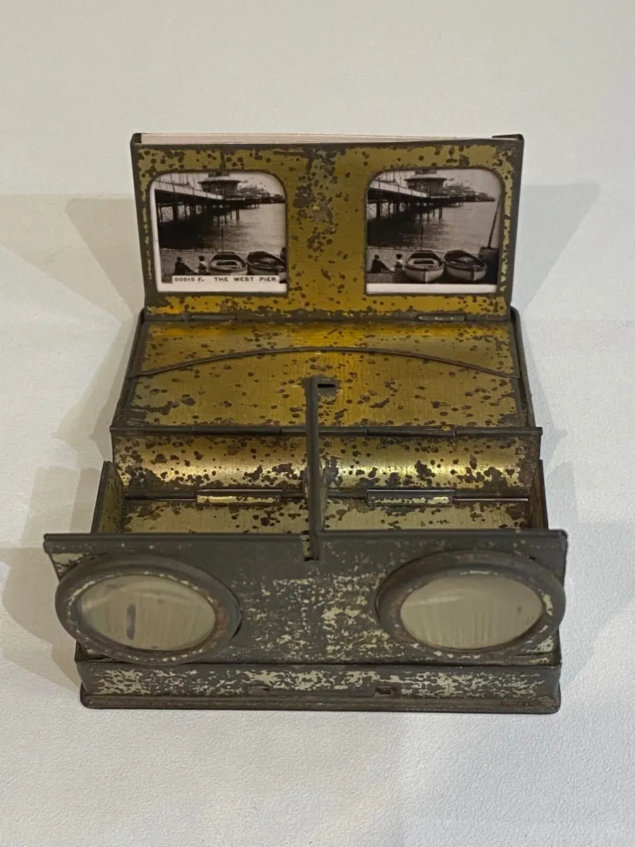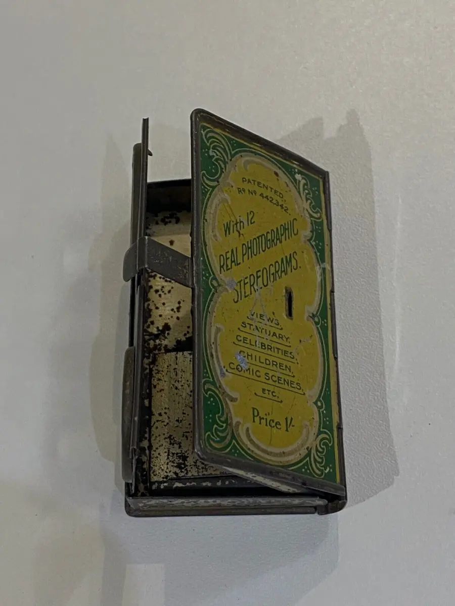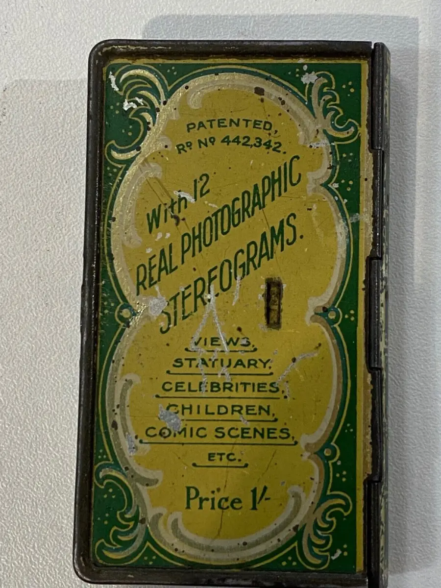 La visionneuse est en étain, avec des lentilles en verre pour le grossissement, et beaucoup pouvaient se plier à plat tandis que d’autres, plus rares, se pliaient en forme de livre.