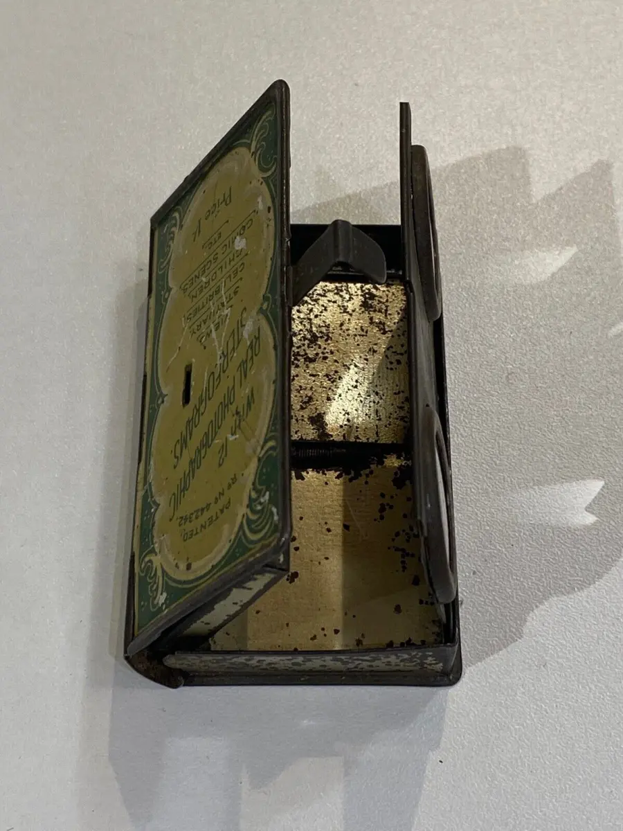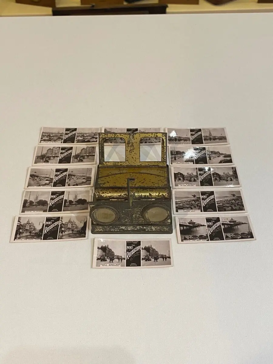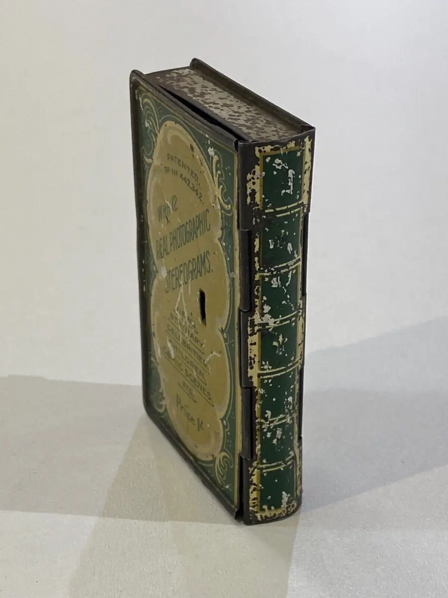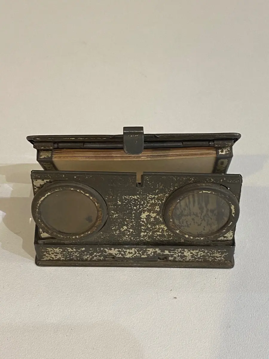 La visionneuse est en étain, avec des lentilles en verre pour le grossissement, et beaucoup pouvaient se plier à plat tandis que d’autres, plus rares, se pliaient en forme de livre.