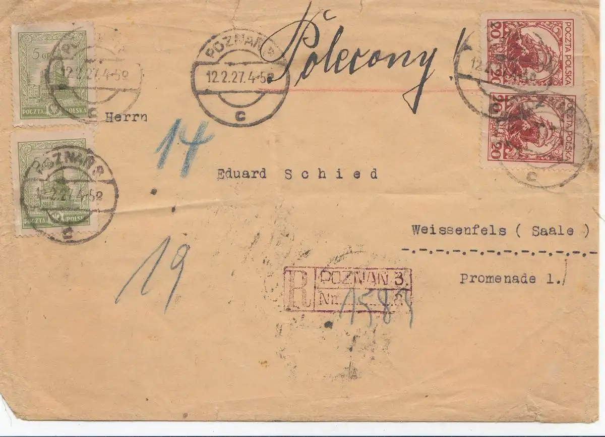 Pologne: 1927 Poznan, vers Weissenfels, recommandé