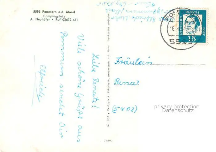 Pommern_Mosel Campingplatz Pommern Mosel postalisch gelaufen 1964 Erhaltung siehe scans [FriedD77] Frierer