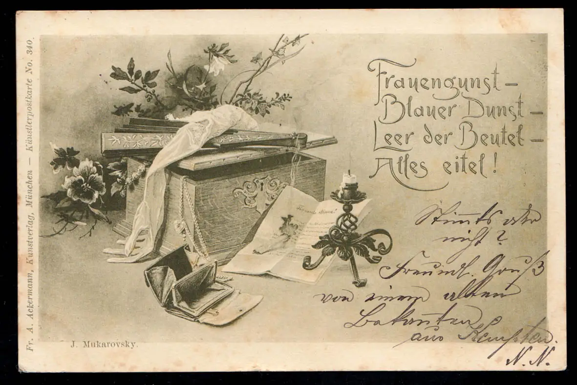 Portefeuille vide de poésie AK - Poème Femme Gunst, Funste bleue, KEMPTEN 1898