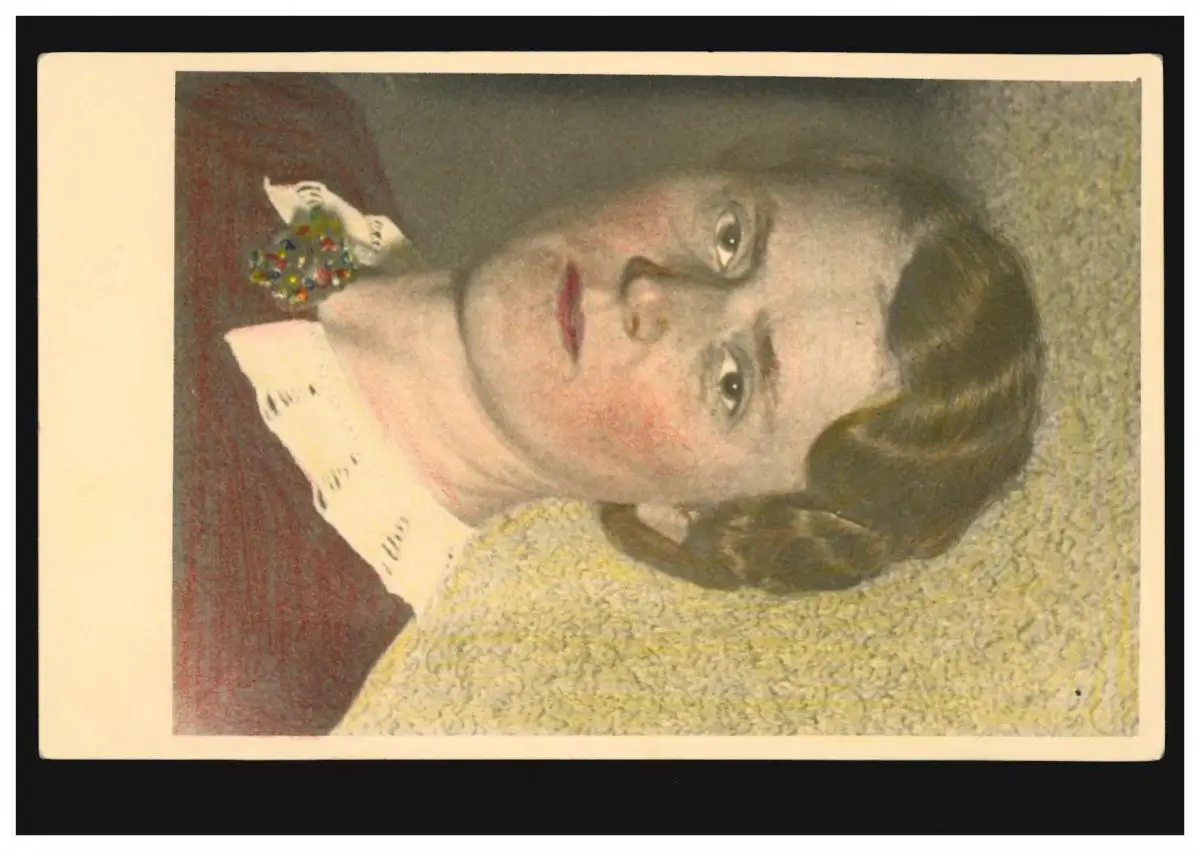 Portrait de femme mode AK en robe rouge avec col de dentelle et broche, non utilisé