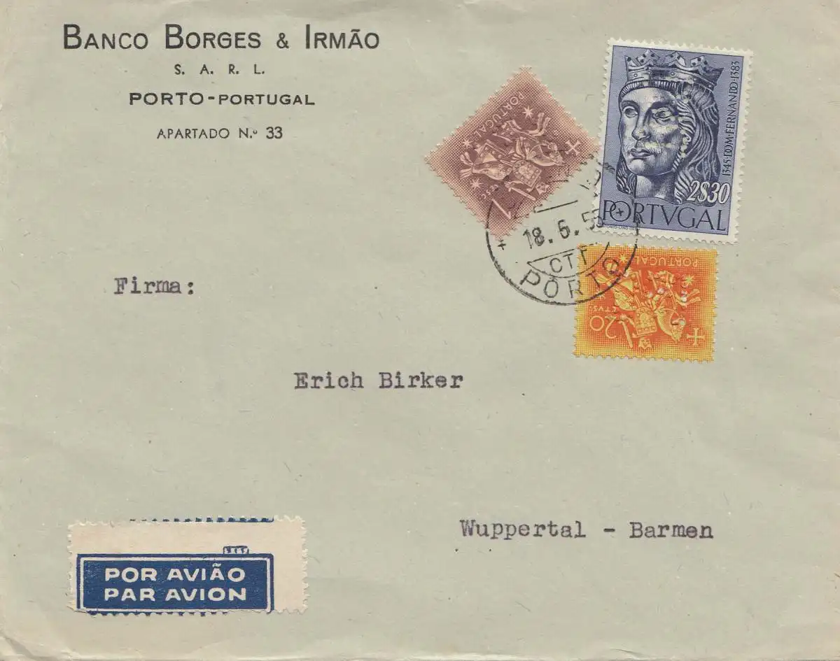 Portugal: 1955 Aéroport de Porto à Wuppertal - Perfin