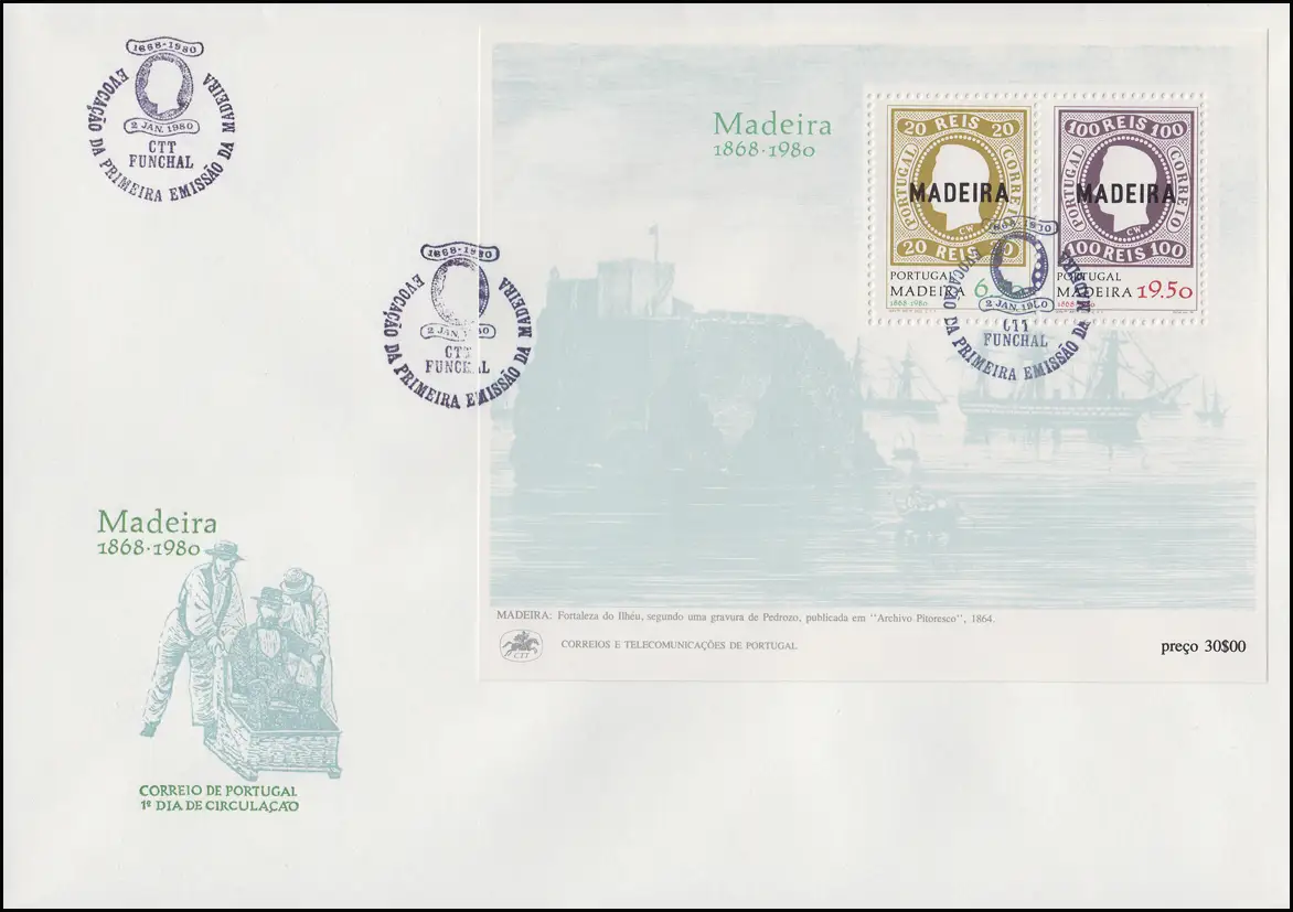 Portugal Madère Première édition imprimée Madère 1868-1980, bloc sur FDC