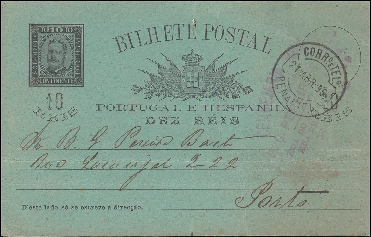 Portugal Carte postale P 24 Carlos I. 10 R noir de PENAFIEL 21.4.1896 à Porto