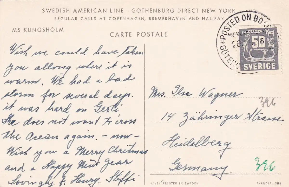 Post Card Swedish American Line: Gothenburg-New-York 1956 to Heidelberg