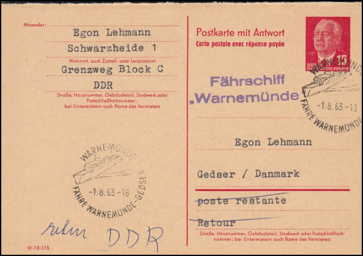 Post bateau ferry Warnemünde vers Gedser sur P 65aF SSt MISE EN GARDE 1.8.1963