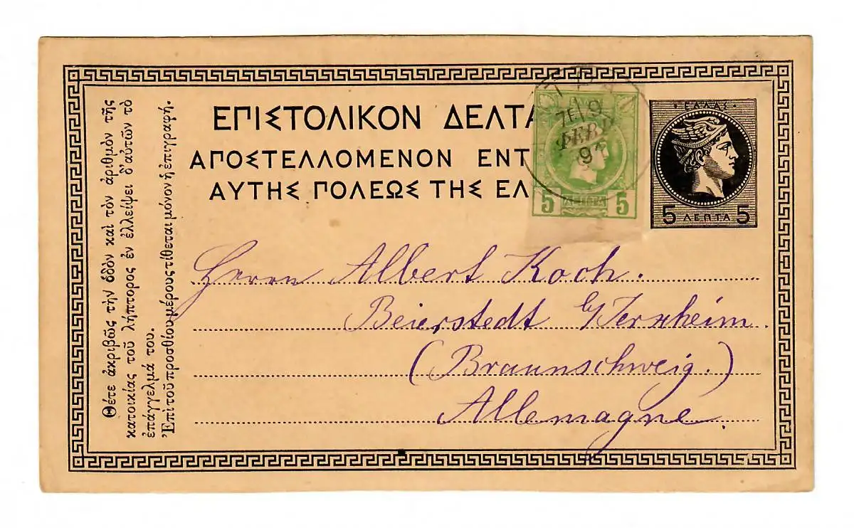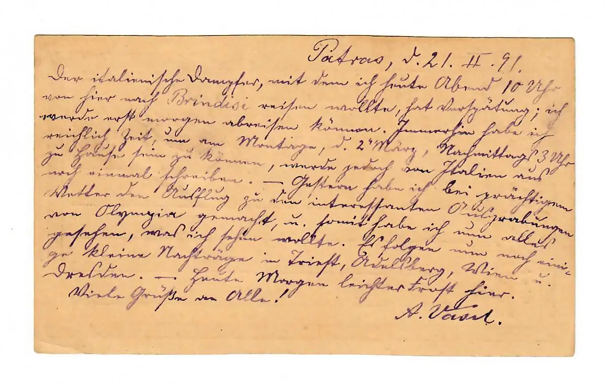Post card 1891 Patras to Beierstedt/Wertheim/Braunschweig, Corner Margin
