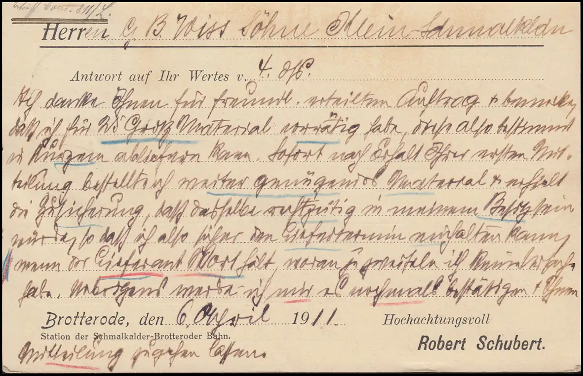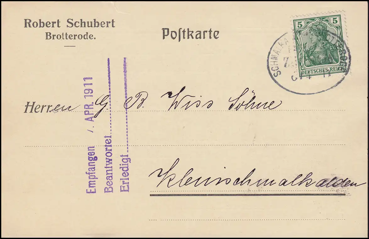 Post de chemin de fer BROTTERODE CHMALKALDE 6.4.1911, carte postale par petite taille
