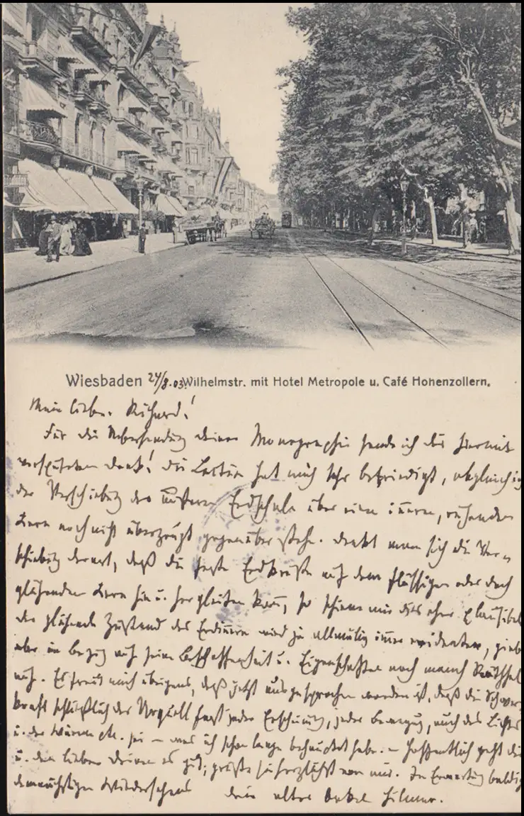 Carte postale Wiesbaden - Hotel Metropole et Cafe Hohenzollern, Tampon d'arrivée AACHEN 25.8.Examen: original Référence produit: 00000000036740>Note: Cet article n'est disponible qu'une seule fois. Vous recevrez exactement l'article représenté.
