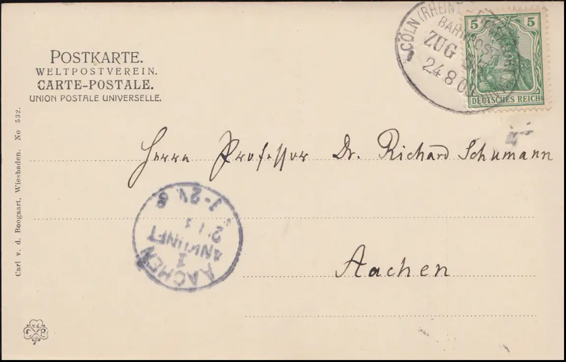 Post de chemin de fer CÖLN (RHEIN) - FRANKFURT (MAIN), ZUG 55 - 24.8.1908 à AK Wiesbaden
