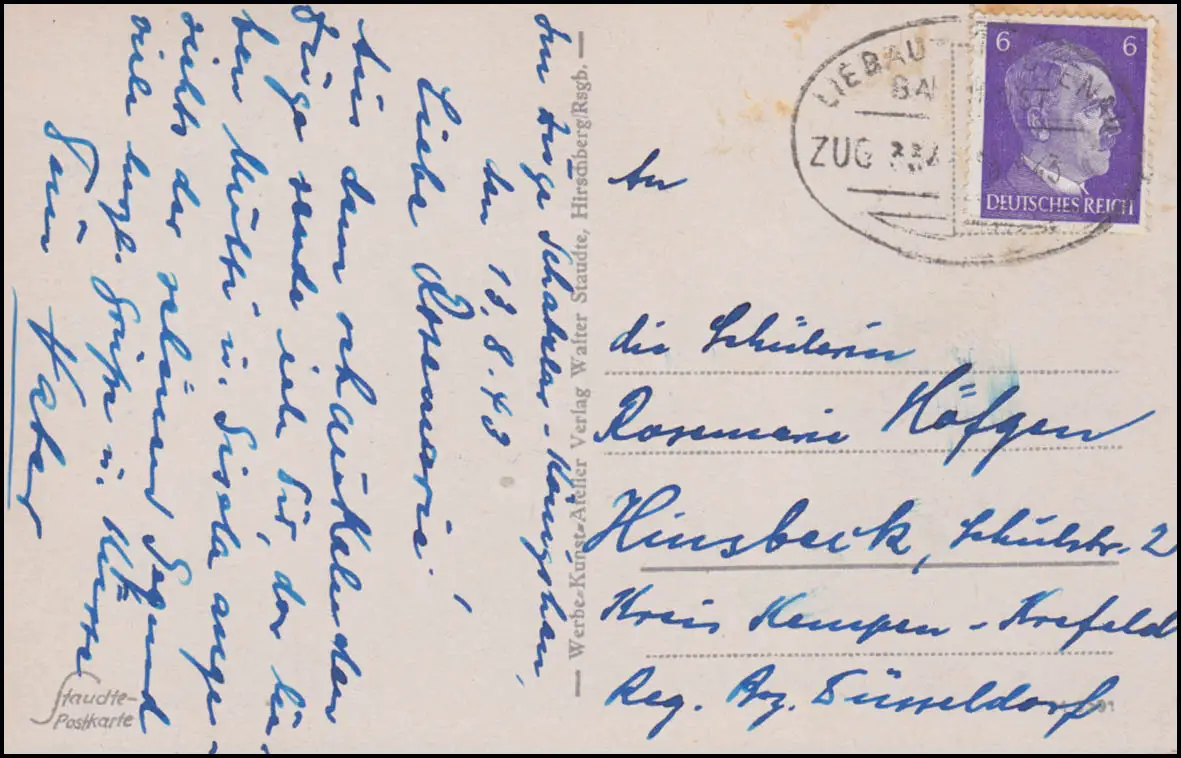 Post de chemin de fer LIEBENAU-TRAUTENAUE 13.8.43, AK Sudetengau Monts géants de Leischnerbaude