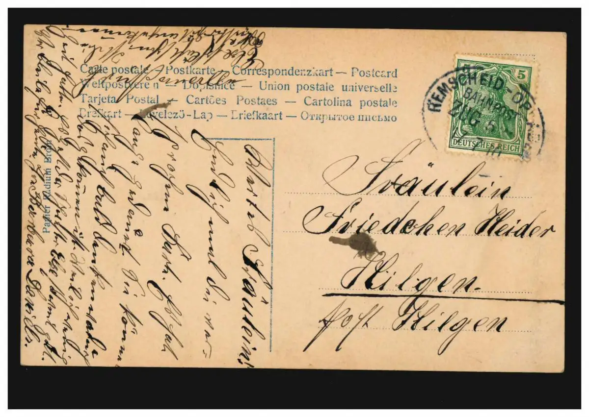 Post de chemin de fer REMSCHEID-OPLADE 17.7.1910 sur mode AK Guillon Bauerin en costume