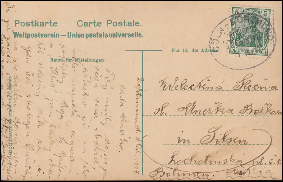 Post de train CÖLN-DORTMUND 384 - 3.11.1907 sur AK Dortmund Gildenhaus vers Pilsen